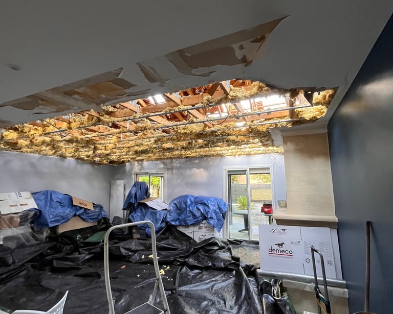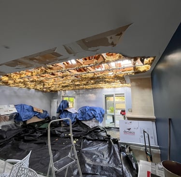 Après un épisode de grêle particulièrement violent en Gironde, nous sommes intervenus en urgence sur une toiture gravement endommagée : tuiles fissurées, gouttières percées, infiltrations d’eau et les plafonds du séjour, du salon et de la salle à manger s’étaient effondrés sous l’effet de l’humidité. Heureusement, les propriétaires étaient absents au moment des faits. Dès notre arrivée, nous avons mis en place un bâchage de protection pour stopper les infiltrations, puis procédé à la réparation complète de la couverture et de la zinguerie. L’intervention a été entièrement prise en charge par leur assurance.